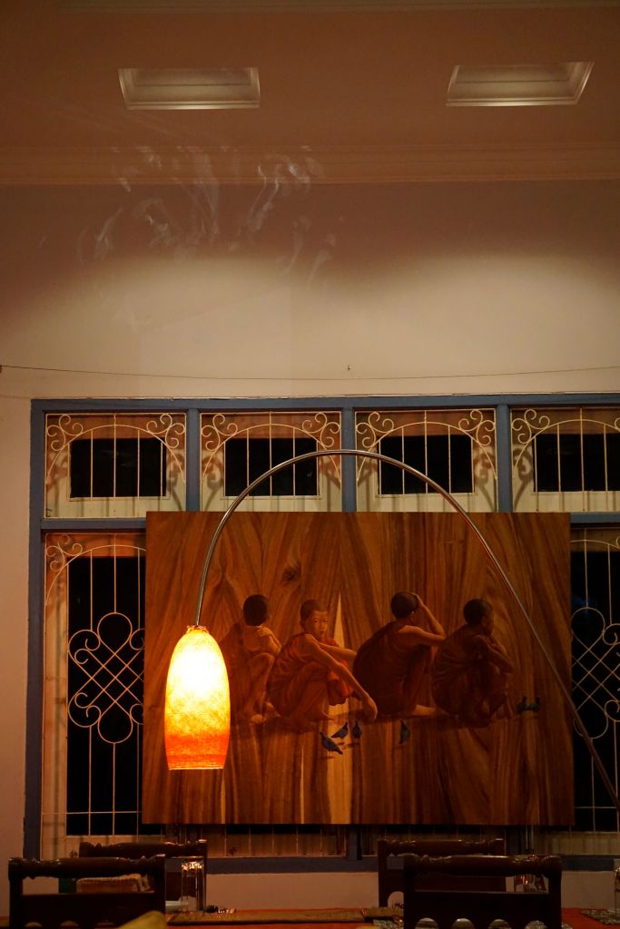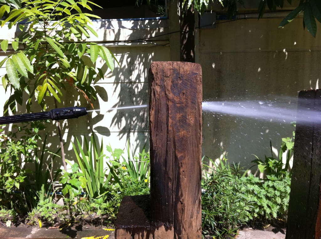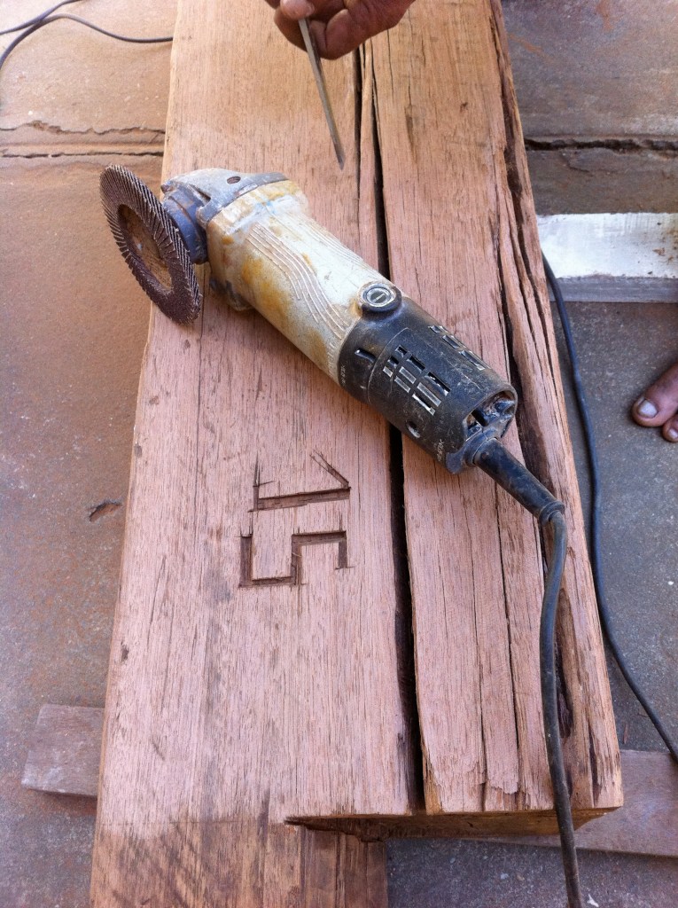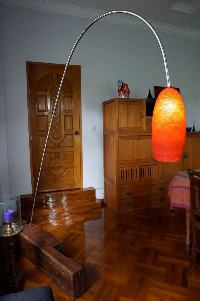 Every lamp is unique, every piece of wood is differently cut, has old incisions made by the foresters when they counted the trees, also painted white Myanmar numbers are on some of them, which I re-painted with a red brillant paint. Most woods are hardwoods, like “Jungle wood”, a very large diameter tree growing in the jungle, having very thick foliage, when it’s raining you can protect yourself under it, no drop can reach you. When the wind or breeze blows all the drops come down like as if it’s raining………….