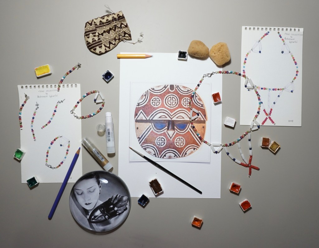 The inspiration of this design comes from the TEKE African tribe living in Central Africa (DRC, RC, Gabon). The long line (filled with the coloured stones) of the necklace is the horizon line, the triangular forms represent the lakes and mountains, three white jade lines representing the rivers lead to the central part in red forming the letter X is the main figure representing the human presence.